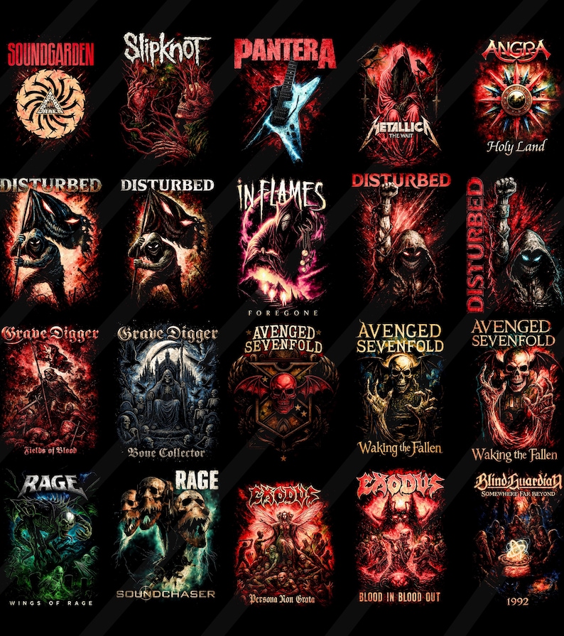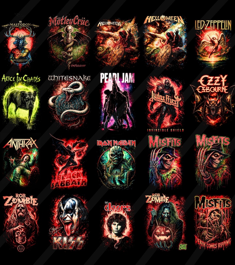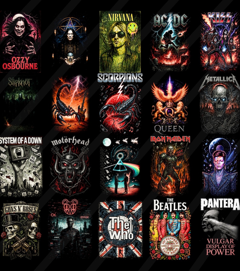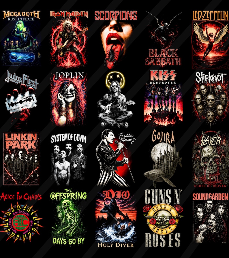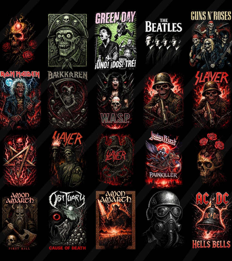 Una colección brutal para amantes del rock: gráficos con actitud, estética oscura, composiciones potentes y estilo clásico/retro, todo en semitono para un acabado mucho más profesional. 😮💨⚡